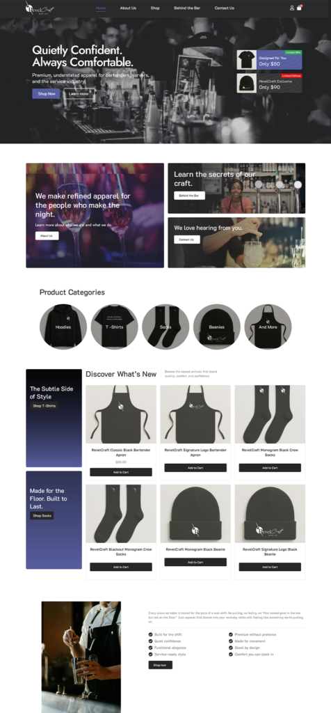 Stylish apparel brand with e-commerce storefront, custom graphics, and bartender-focused community